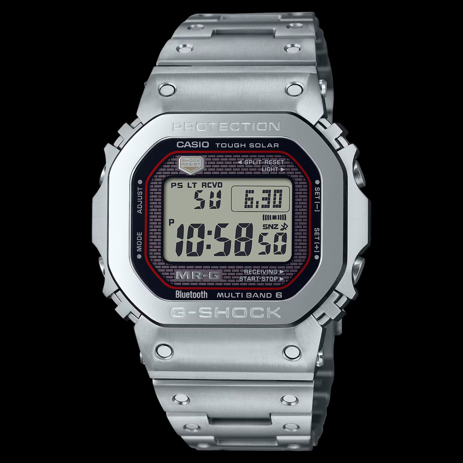 Realizzato in titanio Ti64 con trattamento DLC antigraffio e rifinito con la tecnica di lucidatura Zaratsu, il G-SHOCK MRG-B5000D-1 è tanto resistente quanto elegante. La connettività Bluetooth, la ricezione del segnale radio Multiband 6, la ricarica solare e il display Super Illuminator lo rendono un orologio smart pensato per chi non accetta compromessi.